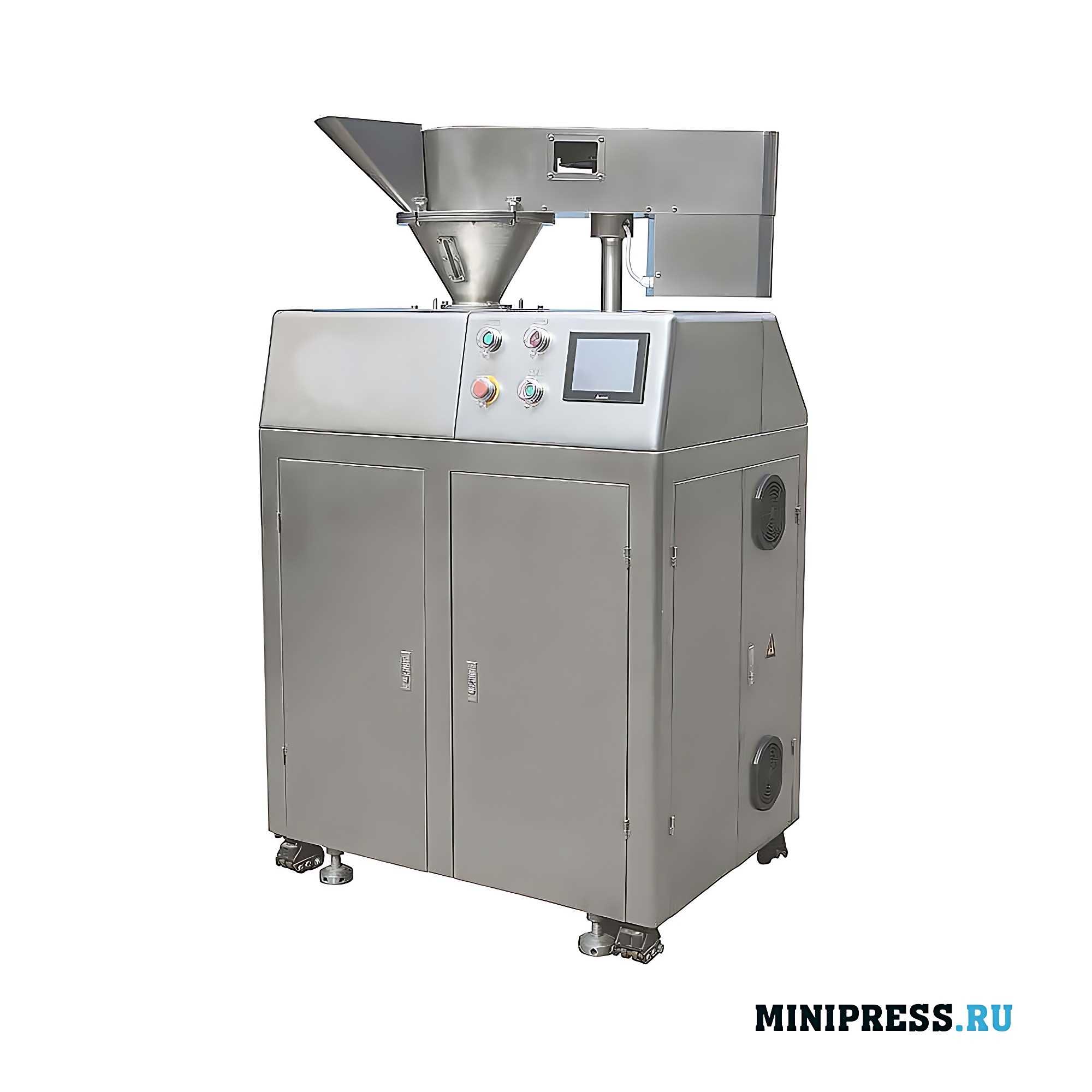 O pó é vertido através de um funil no granulador da imprensa, os rolos girados pelas caixas de engrenagens poderosas pressionam o pó, pressionam-no nas placas, que a máquina descasca automaticamente e esmaga em Pelotas. A elevada força gerada pelo granulador de prensagem assegura que os pellets são produzidos sem humedecer, pressionando apenas o pó. Um sistema hidráulico automático é usado para criar a força de pressão, que bombeia a força necessária. A máquina tem um controle manual do painel, em outra modificação a manutenção da pressão é manual, através do uso de uma bomba hidráulica manual, e um painel de controle eletrônico com um menu em inglês. Granulador: não mistura o pó; não humedece o pó; não mistura o pó humedecido; não seca os grânulos; não separa os grânulos em bom e abaixo do padrão; não produz grânulos do mesmo tamanho de forma. A função do granulador é pressionar o pó em uma placa com rolos e quebrá-lo em pequenas partículas.