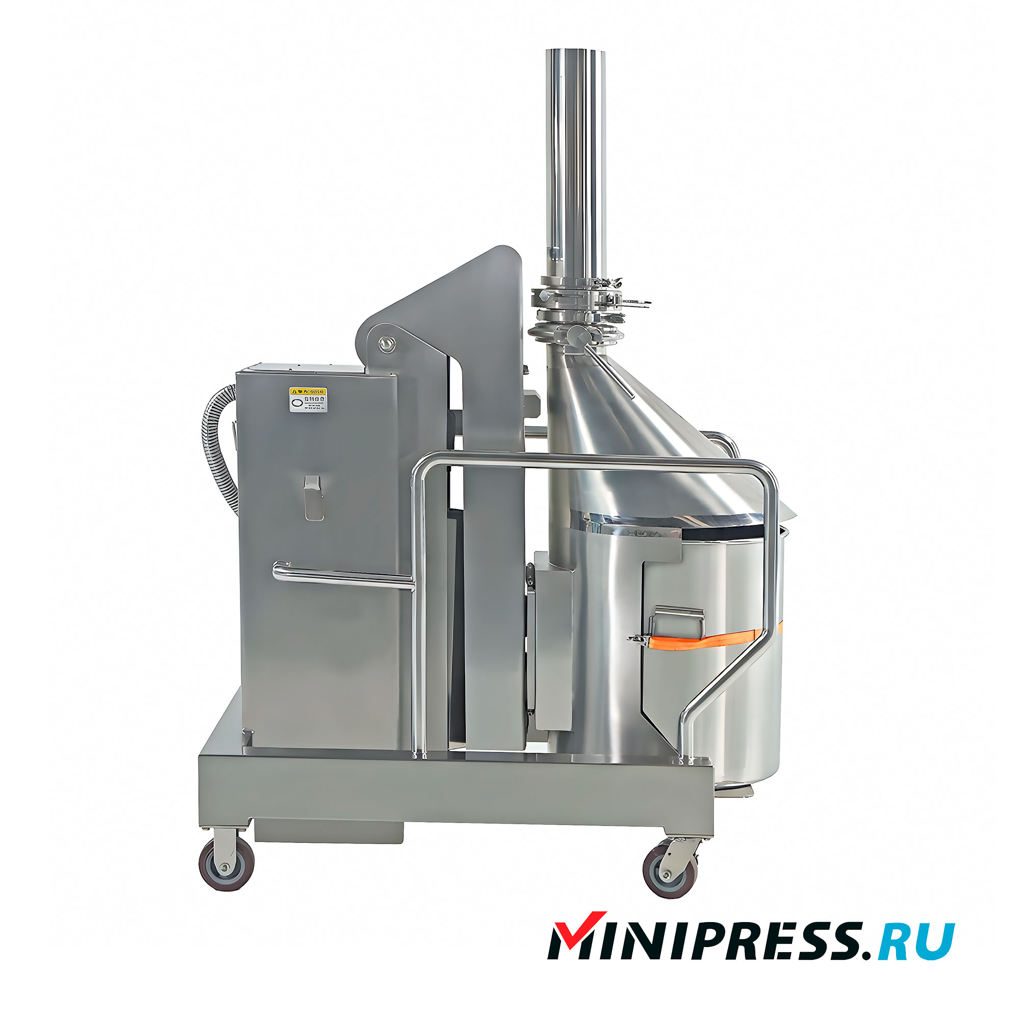 To operate the automatic equipment, it is necessary to connect an electric power supply and a compressed air compressor. The installed container with powder is lifted up in one operation, to the height of the pouring point, the second operation turns the container over with a pneumatic cylinder, at the desired angle, for unloading the material. The range includes 3 models, differing in the methods of lifting and turning over containers. There are models for stainless steel bins and plastic barrels. All containers are securely fixed on the platform with belts. Materials transported: coffee, dextrose, rice, acetylsalicylic acid caustic soda, milk powder, sugar, crushed aluminum oxide, detergent, bird feather, tea, aluminum powder, dry paint, fish meal, nuts, wheat flour, boric acid, nickel powder, gelatin powder, pea plastic granules, brewer’s malt, yeast, coffee beans, gunpowder, potato flour, fertilizer, cocoa powder, dry glue, all kinds of powder materials. All parts of the equipment are made of stainless steel according to GMP standards.