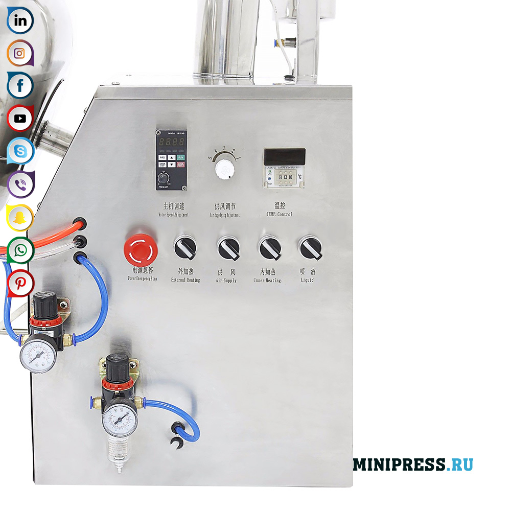 Rasti - plotësisht i mbyllur me çarçafë çeliku. Qasja në rotor dhe motor elektrik është përmes një mbulesë të lëvizshme të pasme. Nga kutia e motorit, përmes një rrip rripi, forca transmetohet në kuti ingranazhi. Një kazan prej çeliku inox është i lidhur me boshtin e ingranazhit. Kaldaja nxehet nga poshtë nga një element ngrohje. Një tub ajri i nxehtë futet në kazan. Sipërfaqja e ndezur e bojlerit ju lejon të ruani temperaturën e shurupit të sheqerit dhe shpërndani në mënyrë të barabartë shellin në të gjithë sipërfaqen e tabletave. Futja në tabletat e substancës që formon guaskën kryhet përmes një sistemi të integruar të llakit. Njësia e kontrollit me butonat Start dhe Stop është fiksuar në trupin e bojlerit. Avantazhi i padyshimtë i bojlerit të panelit është dimensionet e vogla të pajisjes desktop. Përdorimi i një kazani çeliku inox ju lejon të mos shqetësoheni për oksidimin e sipërfaqes së punës. Dizajni i bojlerit është bërë prej çeliku të pandryshkshëm, i cili lejon përdorimin e pastruesve gjatë funksionimit të përditshëm të pajisjeve. Dizajni është shumë i qëndrueshëm.