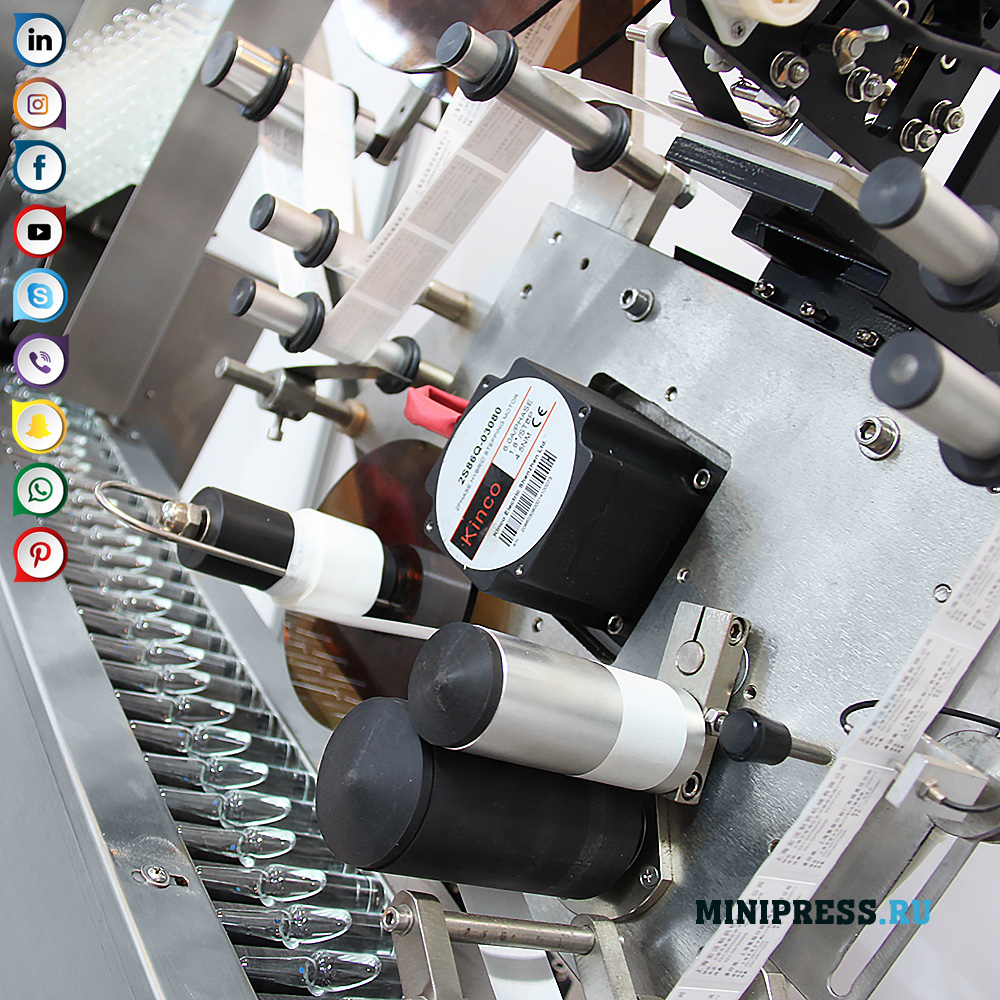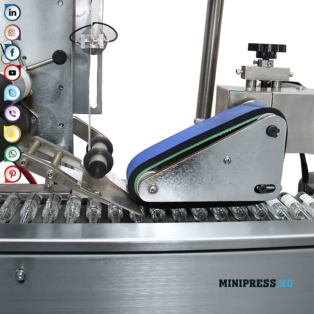 Automatski sistem za vodoravno punjenje boca na transportnoj traci. Sistem se automatski uključuje i izvlači naljepnicu iz rolne i pritisne naljepnicu. Kompaktna struktura i jednostavan rad. Fotoelektrični upravljački elementi, tačnost označavanja, funkcija „bez objekta - zaustavljanje“, automatsko upravljanje naljepnicom koja nedostaje. Glavni dio mašine za etiketiranje izrađen je od nehrđajućeg čelika SUS304. Mogućnost korištenja različitih veličina naljepnica. Sistem pritiska etikete na površinu ampule izbegava mjehuriće zraka. Punjenje naljepnica od rolne s naglim elektromotorom. Ako je potrebno, možete dodati funkciju ispisa serije, brojeva i datuma proizvodnje. Oprema i materijali koji se koriste u proizvodnji nehrđajućeg čelika i legura visoke legure ispunjavaju zahtjeve GMP proizvodnje.