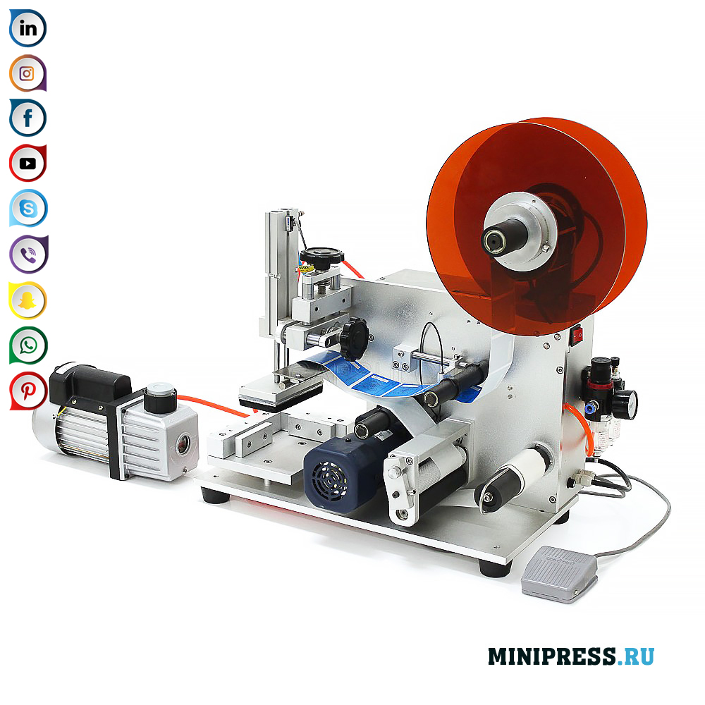 Široki raspon primjene nanosi se samoljepljiva rola naljepnica. Operator ručno instalira kutiju u isječke koji mogu prilagoditi položaj naljepnice naljepnice. Upravljanje pneumatskim cilindrom preko nožne papučice. Mogućnost korištenja različitih veličina naljepnica. Sistem pritiska naljepnice na površinu kutije izbjegava mjehuriće zraka. Punjenje naljepnica od rolne s naglim elektromotorom. Ako je potrebno, možete dodati funkciju ispisa serije, brojeva i datuma proizvodnje. Oprema i materijali koji se koriste u proizvodnji nehrđajućeg čelika i legura visoke legure ispunjavaju zahtjeve GMP proizvodnje.