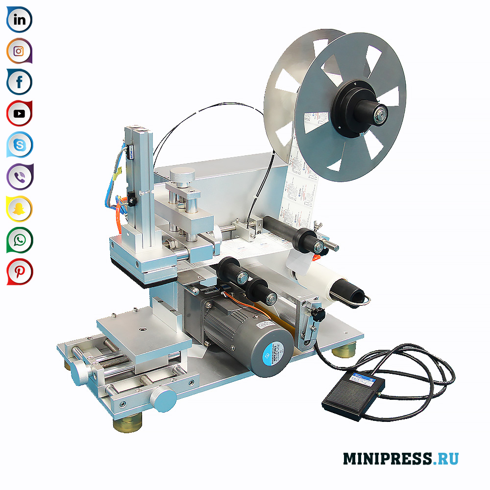 Широка гама от приложения се прилага самозалепваща ролка с етикети. Операторът ръчно инсталира кутията в клиповете, които могат да коригират позицията на стикера на етикета. Работа на пневматичния цилиндър през крачния педал. Възможност за използване на различни размери етикети. Системата за притискане на етикета към повърхността на кутията избягва въздушните мехурчета. Подаване на етикети от ролка със стъпаловиден електродвигател. Ако е необходимо, можете да добавите функцията за печат на серията, числата и датите на производство. Оборудването и материалите, използвани при производството на неръждаема стомана и високолегирани сплави, отговарят на изискванията на GMP производството.