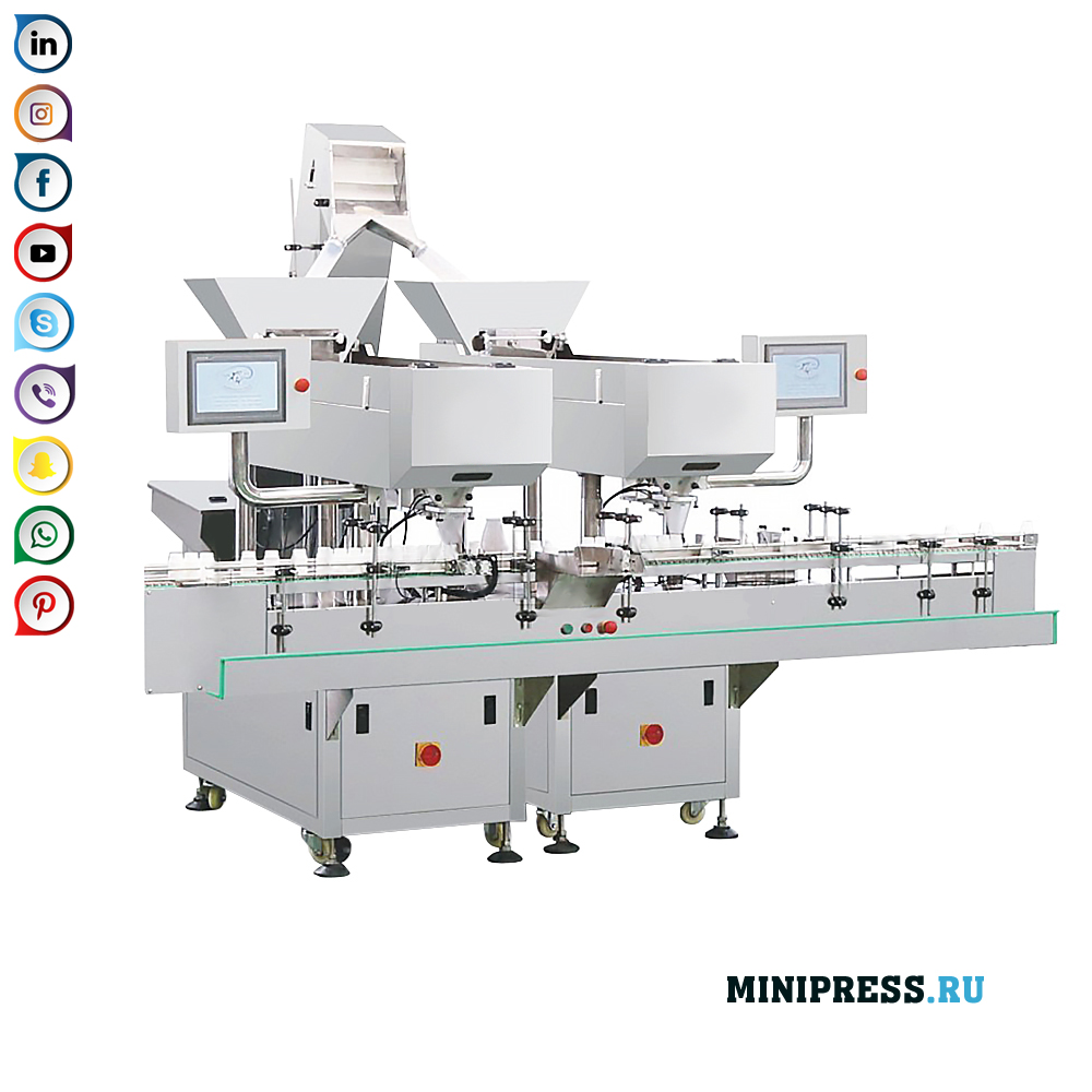 Двойната система на броячи на вибрации и пакетиращи таблетки и твърди желатинови капсули е част от автоматична линия за опаковане на таблетки и желатинови капсули в пластмасови бутилки с уплътняване на гърлото на бутилката с алуминиеви мембрани, капачки за затваряне, лепило за залепване на стикери. Дизайнът има вълнообразни водачи, по които таблетки или желатинови капсули се преместват в контролната зона чрез оптични сензори и след това в бутилки. Количеството се програмира в менюто на електронния контролен панел. Групи таблетки или капсули се изсипват в бутилки, които се подават в зоната за пълнене чрез конвейерна лента. След това бутилките се преместват в машината за затваряне.