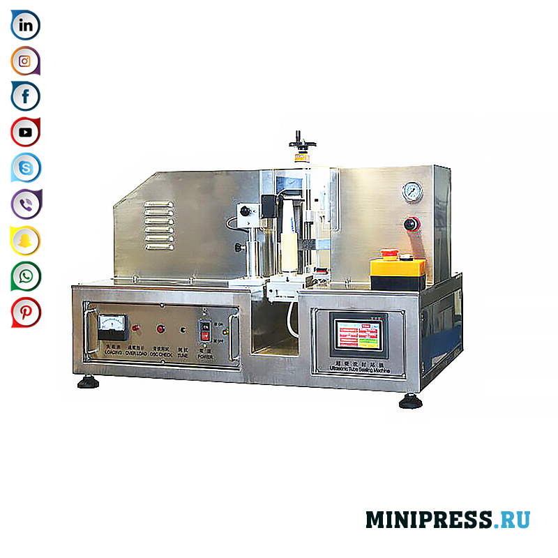 Полуавтоматична настолна машина за ултразвуково запечатване на ръба на пластмасови тръби с кремове и мехлеми. Той се допълва от ориентационната функция на положението на тръбата според етикета, отпечатан върху епруветката. Прилагат се релефната система за изтичане и номер на партидата. Има и механизъм за подрязване на ръба на тръбата. Използва се в производството на козметика, лекарства, храни. Клиентът трябва да предостави размери на тръбите. Производителят прави пластмасови форми по размер на тръбите на клиента. Една машина използва три взаимозаменяеми форми на размер на тръбата. Ако е необходимо, можете да поръчате комплекти от форми за всички интересни размери на тръбите. Краят на тръбата се затяга с пневматично задвижване. Височината на устните се настройва на височината на тръбата.