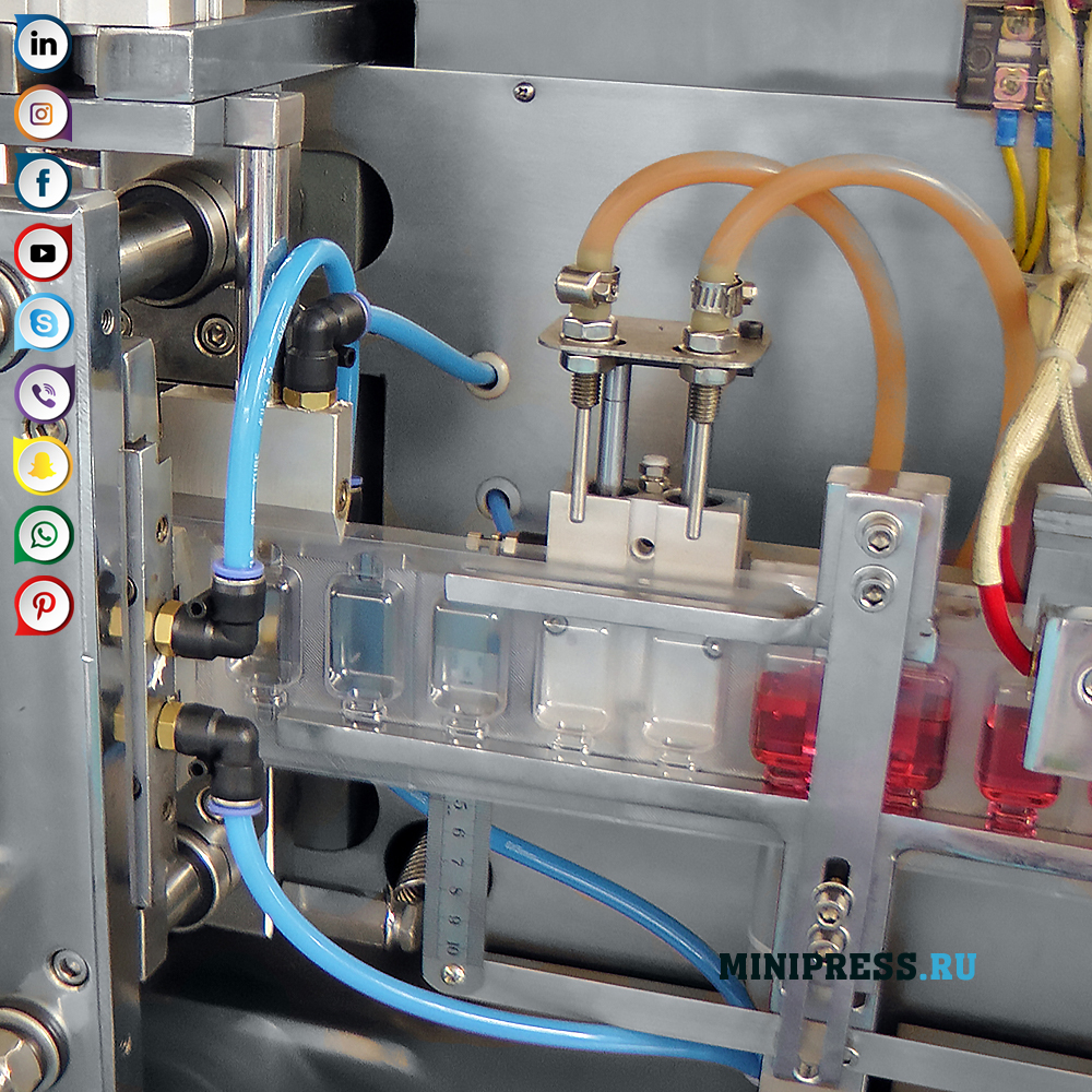 Una màquina automàtica compacta per a la formació de grups d'ampolles de plàstic a partir d'un material enrotllat de PVC i PE i el farciment dosificat de líquids dins d'ells, seguit d'un segellat. Productivitat 6.000 ampolles per hora. Pes 1000 kg. S'utilitza per omplir productes medicinals i alimentaris. La màquina forma ampolles de plàstic enrotllat. Hi ha un dipòsit d’emmagatzematge de líquid, a petició del client, es munta una calefacció controlada i programada. Les dosis de fluids estan regulades per bombes peristàltiques. Fabricat en acer inoxidable d'alta qualitat. Proporcionem instruccions detallades per configurar equips per omplir i segellar. Abans de l’enviament al client, les màquines es comproven i es proven en producció. Ens ajudarà en la compra de materials enrotllables per als envasos. Completat i rendiment garantit. Mantenim estoc de peces i consumibles al magatzem. El preu inclou el lliurament a la ciutat del comprador.