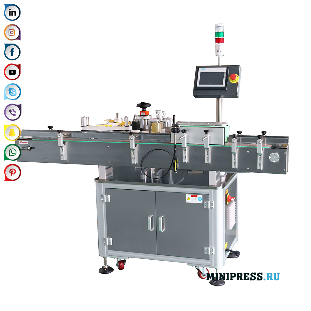 Dobar stroj za lijepljenje naljepnica na okrugle staklene boce s lijekovima. Izrađen u skladu s opremom za punjenje i zatvaranje sirupa i tinkture s poklopcima.