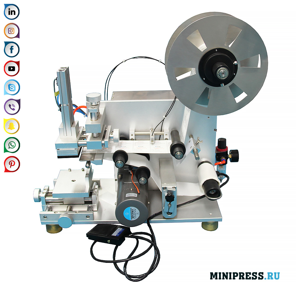 Širok raspon primjene nanosi se samoljepljiva rola naljepnica. Operater ručno instalira okvir u isječke koji mogu prilagoditi položaj naljepnice naljepnice. Upravljanje pneumatskim cilindrom preko nožne papučice. Sposobnost korištenja različitih veličina naljepnica. Sustav pritiska naljepnice na površinu kutije izbjegava mjehuriće zraka. Punjenje naljepnica s valjka s naglim elektromotorom. Ako je potrebno, možete dodati funkciju ispisa serije, brojeva i datuma proizvodnje. Oprema i materijali koji se koriste u proizvodnji nehrđajućeg čelika i legure visoke legure udovoljavaju zahtjevima GMP proizvodnje.