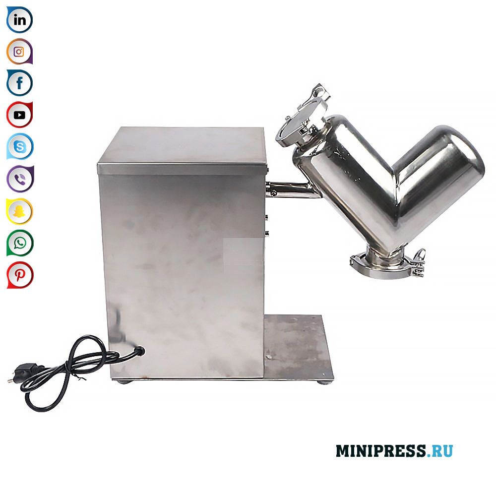 Míchačka je vyrobena z nerezové oceli. Hlavní nádoba, do které se prášek nalije, má tvar V. Z elektromotoru je hřídel poháněna. Nádoba se začne otáčet kolem své osy a prášek se mísí nejlepším způsobem. Po smíchání se nádoba odpojí nebo sníží, aby se vypudil prášek. Nádoba má víko z nerezové oceli, které zabraňuje tvorbě prachu. Nejlepší kompaktní zařízení pro míchání suchých sypkých prášků.