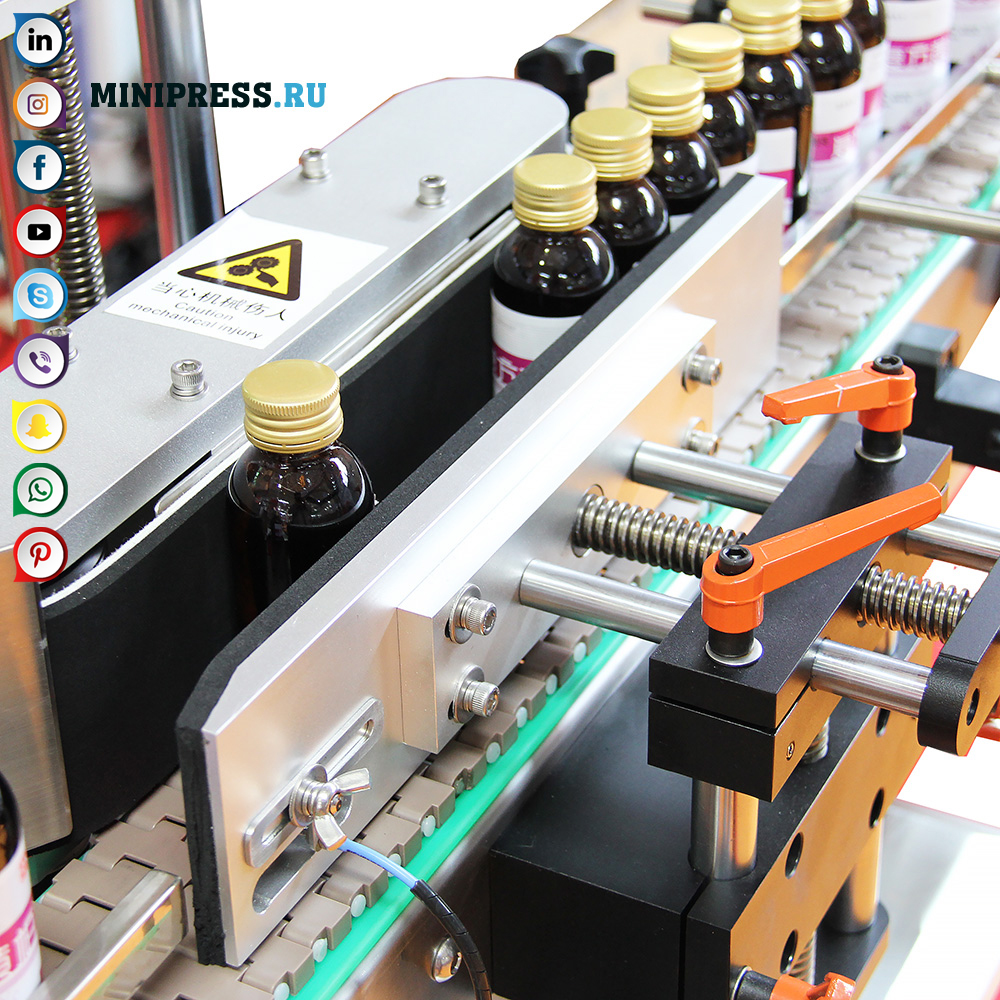 Automatisk transportbåndstilførselssystem. Systemet tændes automatisk og trækker etiketten fra rullen og trykker på etiketten. Kompakt struktur og nem betjening. Fotoelektriske kontrolelementer, mærkningsnøjagtighed, "ingen objekt - stop" -funktion, automatisk kontrol af en manglende etiket. Hoveddelen af etiketteringsmaskinen er lavet af rustfrit stål SUS304. Mulighed for at bruge forskellige størrelser af etiketter. Systemet med at trykke etiketten på flasken overflader undgår luftbobler. Arkiver etiketter fra en rulle med en trinvis elektrisk motor. Om nødvendigt kan du tilføje udskrivningsfunktionen for serien, numrene og produktionsdatoen. Det udstyr og materialer, der anvendes til fremstilling af rustfrit stål og højlegeringer, opfylder kravene til GMP-produktion.