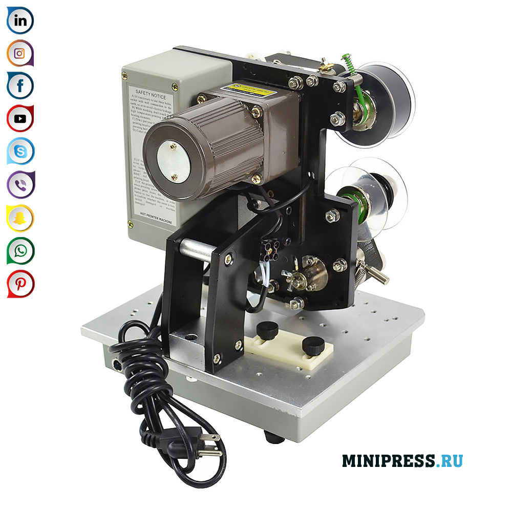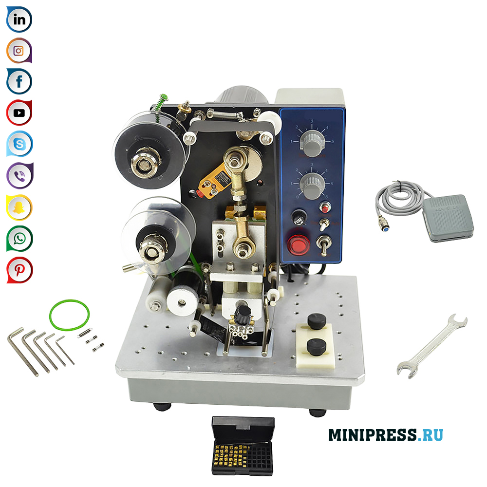 Model van een semi-automatische elektrische printer voor het afdrukken van vervaldatums en batchnummers voor afdrukken door hot stamping-informatie op alle zachte oppervlakken van de verpakking. Het werkt met thermische rollen van verschillende kleuren. Het is mogelijk om met deze apparatuur gemetalliseerde stempels van de productiedatum te gebruiken. De kit wordt geleverd met een plastic doos met zetletters, waaruit u alle digitale en tekstcombinaties kunt combineren. Ook onder de bestelling produceren en verkopen wij brieven volgens klantontwerp. Handig desktopmodel met voetpedaal.