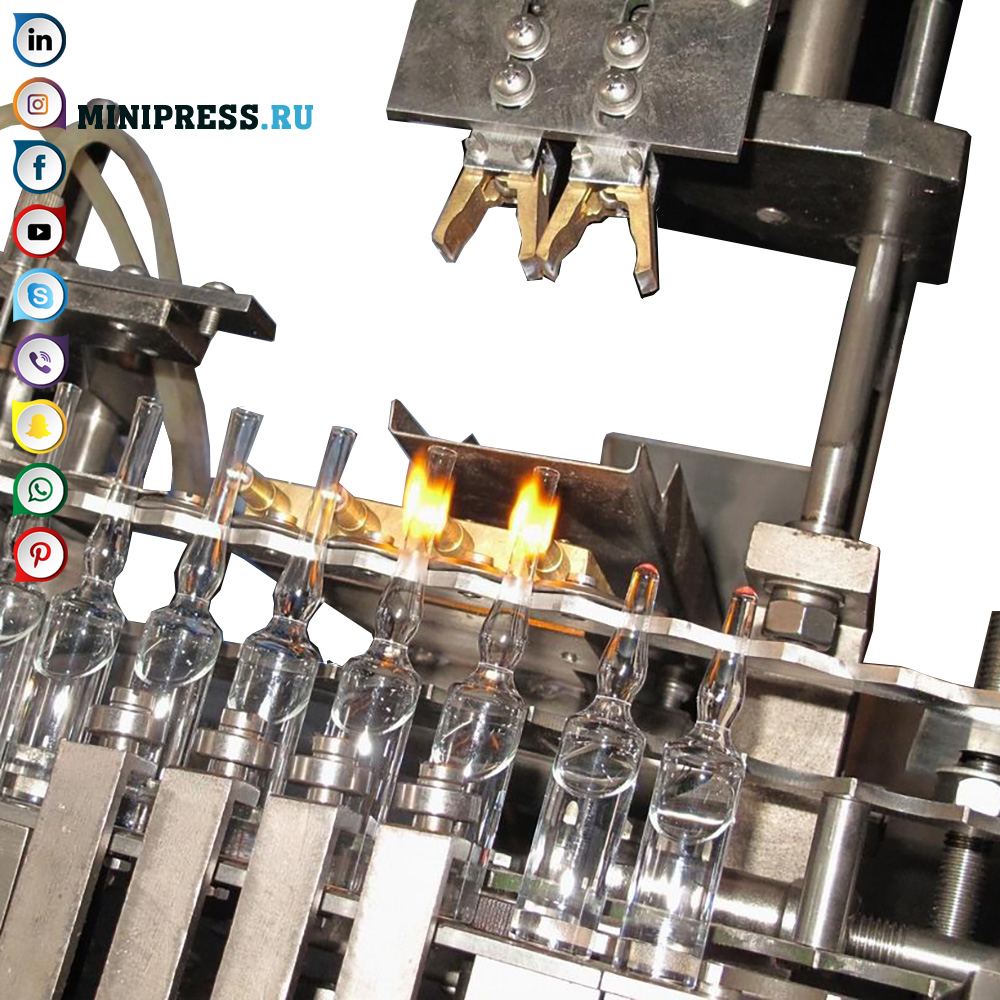 Een unieke reeks automatische machines voor het vullen en afdichten van glazen ampullen. Modellen verschillen van elkaar in kleine opties, dosering en prestaties. De ampullen worden uit de trechter genomen en komen vervolgens via een transportband in de botteling. De operator past de dosering aan, binnen de mogelijkheden van de machine. Het vullen van glazen ampullen wordt uitgevoerd door een groep. De machine brengt een groep ampullen onder de naalden, de transportband stopt en de naalden worden in de ampullen neergelaten. Het volgende is het vullen van de ampullen. Vervolgens worden de glazen ampullen overgebracht naar de branderzone. De verbrandingstemperatuur en vlamintensiteit zijn ook instelbaar. Nadat de hals van de ampul is verwarmd met speciale klemmen, wordt de bovenkant van de ampul gevormd. De top heeft een afgeronde contour van regelmatige uniforme vorm. De hoogte van alle afgewerkte ampullen en rondheid wordt constant herhaald, zonder verschillen. Let op, voor de bediening van de machine voor het vullen en afdichten van glazen ampullen is een machine voor het wassen en drogen van ampullen vereist. Evenals een interne sterilisatiemachine voor injectie.