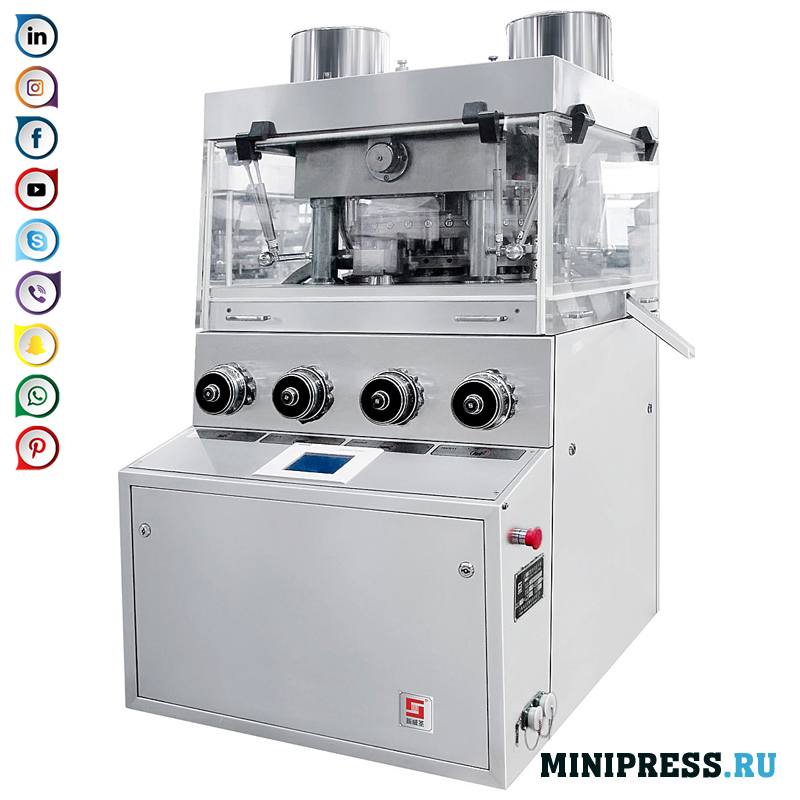 Hoge snelheid roterende tabletpers voor de productie van zouttabletten. Model RZK-25 is een automatische rotatiepers van het carrouseltype. Het schema van de pers is om, door middel van een versnellingsbak, rotatie over te brengen van een elektromotor naar een poelie op de as waarvan een rotor zich bevindt. Een roterende tabletpers is ontworpen om tabletten uit zout te comprimeren. De prestaties zijn instelbaar, met een maximale snelheid van 60.000 tabletten in 1 uur. Dit rotatiepersmodel heeft een volledig gesloten compartiment in een geïsoleerd compartiment. De zuiverheid van de afgewerkte tabletten is gewaarborgd zonder kruisbesmetting van buitenaf te veroorzaken. Compressiecompartiment is volledig gemaakt van roestvrij staal, in overeenstemming met de vereisten van GMP, voor de productie van geneesmiddelen. Chroomstalen rotoroppervlak om slijtage te voorkomen. Snelheidsregeling en prestaties worden bestuurd door een frequentieomvormer. De motor is verbonden met de plaat om trillingen en trillingen tijdens het gebruik te voorkomen. Een overbelastingsbeveiliging is in de machine aanwezig om schade door stoten en apparaten te voorkomen, wanneer overbelasting optreedt, stopt de machine automatisch. De tandwielaandrijving van de machine gebruikt een volledig gesloten oliesmeermiddel met een lange levensduur om kruisbesmetting te voorkomen. Alle controllers en apparaten bevinden zich gescheiden van de machine, voor bedieningsgemak hebben de seriemachines beschermend voor gebroken bovenste stoten. De rotorsnelheid is instelbaar. We vullen deze pers aan met mallen: matrijzen met verschillende diameters (van 12 tot 25 mm) en ponsen. De stoten met een lang lichaam zijn boven en zijn geïnstalleerd in het bovenste deel van de pers. Stoten met een kort lichaam en een lang werkend deel zijn de bodem en hun taak is om de tablet uit de matrix te duwen. Ze worden onderaan de pers geïnstalleerd. De pers werkt automatisch. Voordat u de pers op het netwerk aansluit en aan het werk begint, moet u de video-instructie zorgvuldig bestuderen en vertrouwd raken met de principes van de werking ervan. Daarna wordt de werking ervan begrijpelijk en eenvoudig voor u. De pers heeft een elektromotor, evenals een debugwiel met een handvat. Alle aanpassingen en instellingen worden in de handmatige modus uitgevoerd door het wiel te draaien. Wees voorzichtig bij het aansluiten van de elektromotor, de richting moet overeenkomen met de pijl. Het poeder wordt via een trechtervormige trechter in de pers geladen. Het kan eenvoudig worden verwijderd, gewassen en teruggeplaatst. Poeder wordt vanuit de hopper door de feeder gevoerd. Het is mogelijk om een actieve feeder met gedwongen toevoer van poeder in de matrix te leveren. Wanneer de rotor van de pers draait, wordt het poeder in de matrix gevoerd, waar het persen plaatsvindt en vervolgens wordt de voltooide tablet naar het oppervlak geduwd. We zullen alle sets persgereedschap op bestelling maken (ponsen en matrijzen voor roterende tabletpersen).