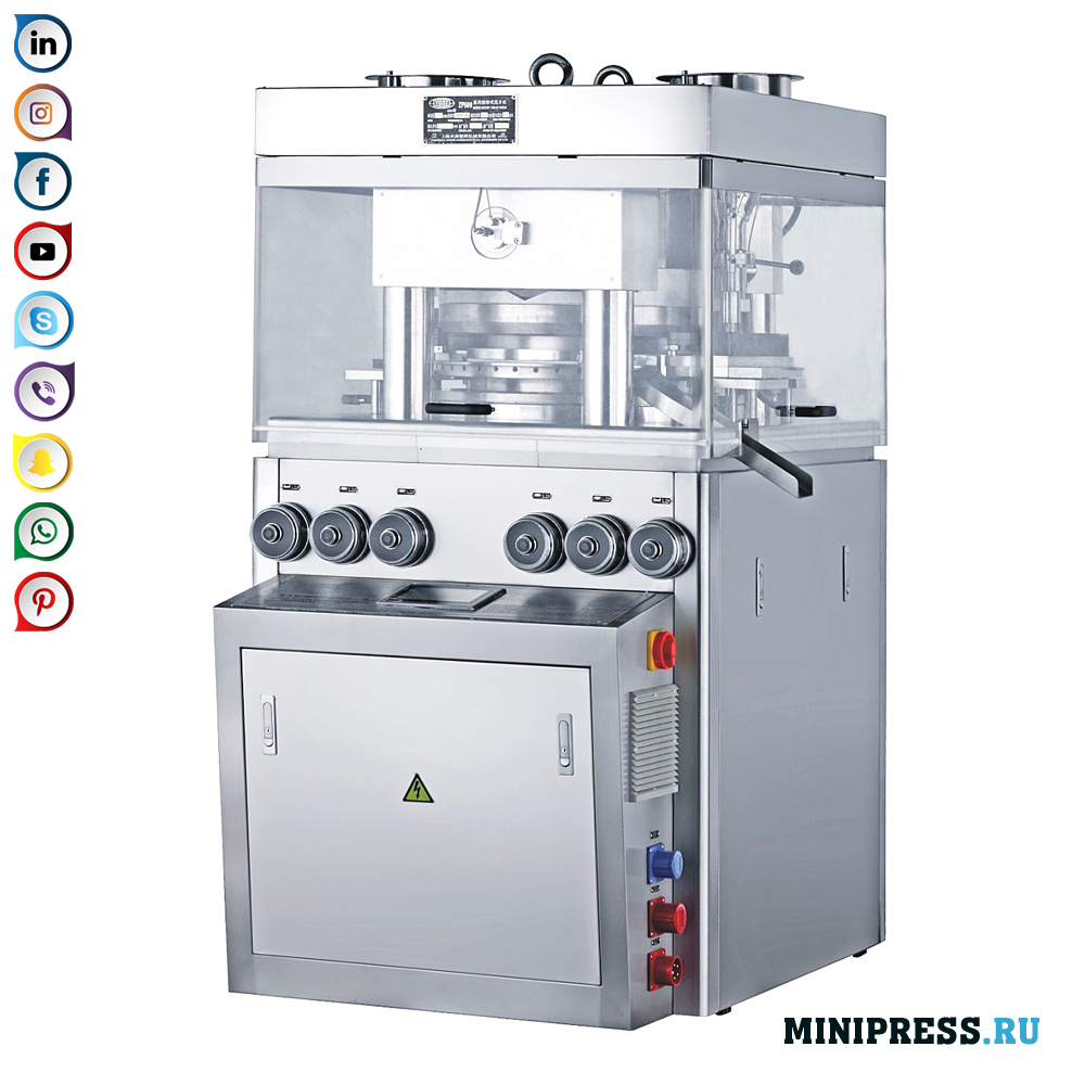 Nopea pyörivä tablettipuristin tabletisarjan tuottamiseksi, tablettijauheiden valmistusvälineenä. Pyörivä tablettipuristin on rakenteeltaan yksinkertainen ja helppo käyttää. Malli RZJ-51 on automaattinen karusellityyppinen pyörivä puristin. Puristimen kaavio on siirtää kierros vaihdelaatikon avulla sähkömoottorista pyörään, jonka akselilla roottori sijaitsee. Pyörivä tablettipuristin on tarkoitettu tablettien puristamiseen rakeisesta jauhemassasta. Tuottavuutta säädellään, enimmäisnopeus on 180 000 tablettia tunnissa. Roottorin nopeus on säädettävissä. Täydennämme tämän puristimen muoteilla: erimittaisten muottien (6 - 22 mm) muotteilla ja stansseilla. Pitkän rungon lävistimet ovat ylempiä ja asennetaan puristimen yläosaan. Lävistimet, joissa on lyhyt runko ja pitkä työosa, ovat pohja, ja niiden tehtävänä on työntää tabletti ulos matriisista. Ne on asennettu puristimen alaosaan. Lehdistö toimii automaattisesti. Ennen kuin liität lehdistön verkkoon ja aloitat työn, sinun on tutkittava huolellisesti video-ohje ja perehdyttävä sen toimintaperiaatteisiin. Sen jälkeen sen käytöstä tulee sinulle ymmärrettävää ja yksinkertaista. Puristimessa on sähkömoottori sekä kahvalla varustettu virheenkorjauspyörä. Kaikki säätö- ja asetukset tehdään manuaalisessa tilassa pyörää kiertämällä. Ole varovainen kytkeessään sähkömoottoria, suunnan tulee olla nuolen mukainen. Jauhe ladataan puristimeen suppilomaisen suppilon läpi. Se voidaan helposti poistaa, pestä ja asentaa takaisin. Jauhe syötetään suppilosta syöttölaitteen kautta. On mahdollista toimittaa aktiivinen syöttölaite jauheen pakotetulla syötöllä matriisiin. Kun puristimen roottori pyörii, jauhe syötetään matriisiin, jossa puristus tapahtuu, ja sitten valmis tabletti työnnetään pintaan. Puristimen rungossa on ohjausyksikkö. Valmistamme tilauksesta kaikki puristustyökalusarjat (pyöreät tablettipuristimet).