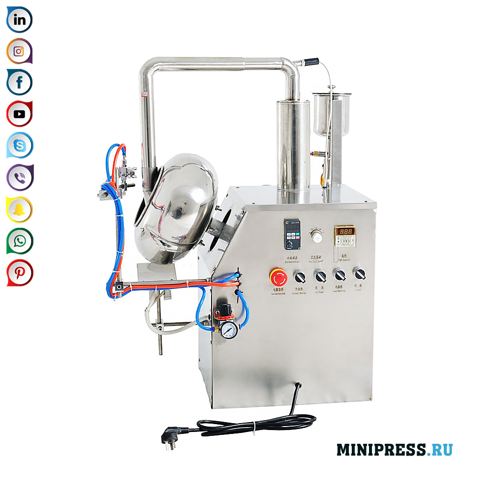 Θήκη - πλήρως κλειστή με φύλλα από ανοξείδωτο χάλυβα. Η πρόσβαση στο ρότορα και στον ηλεκτροκινητήρα γίνεται μέσω αποσπώμενου πίσω καλύμματος. Από τη τροχαλία του κινητήρα, μέσω μιας κίνησης με ιμάντα, η δύναμη μεταδίδεται στο κιβώτιο ταχυτήτων. Ένας λέβητας ανοξείδωτου χάλυβα συνδέεται με τον άξονα του κιβωτίου ταχυτήτων. Ο λέβητας θερμαίνεται από κάτω από ένα στοιχείο θέρμανσης. Ένας σωλήνας θερμού αέρα εισάγεται στο λέβητα. Η θερμαινόμενη επιφάνεια του λέβητα σάς επιτρέπει να διατηρείτε τη θερμοκρασία του σιροπιού ζάχαρης και να κατανέμετε ομοιόμορφα το κέλυφος σε ολόκληρη την επιφάνεια των δισκίων. Η εισαγωγή στα δισκία της ουσίας που σχηματίζει το κέλυφος πραγματοποιείται μέσω ενσωματωμένου συστήματος ψεκασμού. Η μονάδα ελέγχου με τα πλήκτρα Start και Stop είναι στερεωμένη στο σώμα του λέβητα. Το αναμφισβήτητο πλεονέκτημα του λεβητοστασίου είναι οι μικρές διαστάσεις της επιτραπέζιας συσκευής. Η χρήση ενός λέβητα από ανοξείδωτο ατσάλι σας επιτρέπει να μην ανησυχείτε για την οξειδώση της επιφάνειας εργασίας. Ο σχεδιασμός του λέβητα είναι κατασκευασμένος από ανοξείδωτο χάλυβα, ο οποίος επιτρέπει τη χρήση απορρυπαντικών στην καθημερινή λειτουργία του εξοπλισμού. Ο σχεδιασμός είναι πολύ σταθερός.