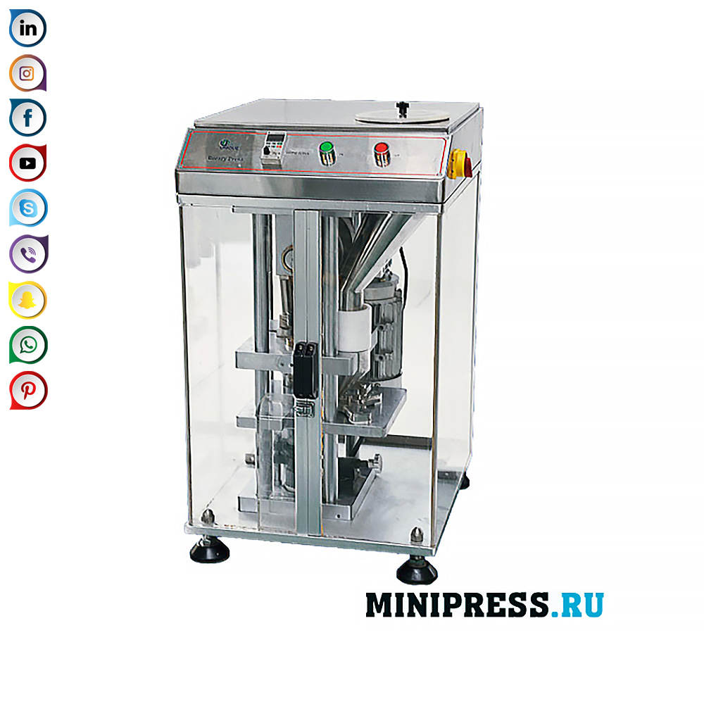 Ez a modell olyan kis cégeknek, kezdő gyártóknak, tudományos és oktatási intézményeknek egyaránt alkalmazható, amelyek sajtológépet használnak kis méretű vagy kísérleti tabletta-tételek sajtolásához, valamint technológiák hibakeresési eszközévé válnak a gyártási folyamatban, és kiválasztják a sajtoláshoz szükséges összetevőket tablettát. A sajtó kompakt és könnyen beállítható. A UNIC 600A tablettaprés egy lyukasztó, excentrikus típusú sajtó. A sajtó vázlata az, hogy sebességváltó segítségével továbbítsa a forgást az elektromos motorról egy olyan tárcsára, amelynek tengelyén egy excenter található. A sajtolót 1, 2 és 3 darab tabletták préselésére tervezték. A termelékenység 3600 tabletta óránként 1 ütésnél, 7200 tabletta óránként 2 ütésnél, 10800 tabletta óránként 3 ütésnél. Az UNIC 600A tablettaprés egy sor szerszámkészlettel érkezik: különböző átmérőjű (6-25 mm-es) matricák és lyukasztók. Néhány lyukasztónak hosszú test és rövid szár van, míg mások éppen ellenkezőleg, rövid test és hosszú szár. A hosszú testű lyukasztó a felső és a sajtó felső részébe van felszerelve. Az alsó rész egy lyukasztó, rövid testtel és hosszú munkadarabmal rendelkezik, és feladata a tabletta kihúzása a mátrixból. A sajtó aljára van felszerelve. A prés csak automatikusan működik. A sajtó hálózati csatlakoztatása és a munka megkezdése előtt alaposan meg kell tanulmányoznia a video utasítást, és meg kell ismerkednie a működésének alapelveivel. Ezt követően a működése érthetővé és egyszerűvé válik az Ön számára. A sajtónak van egy elektromos motorja, valamint egy fogantyúval ellátott hibakereső kerék. Az összes beállítási munkát és beállítást kézi üzemmódban kell elvégezni a kerék forgatásával. Vigyázzon az elektromos motor csatlakoztatásakor, az iránynak meg kell egyeznie a nyíllal. A port kivehető tölcsér alakú garaton keresztül töltik be a sajtóba. Könnyen eltávolítható, mosható és visszahelyezhető. A port a tartályból a mozgatható lábon keresztül táplálják. Amikor a prés forog, a nyomótalp mozog, és továbbítja a port a mátrixba, ahol megnyomják, majd a kész tablettát a felületre tolják. A sajtó testén van egy vezérlőegység (BE és KI gombok).