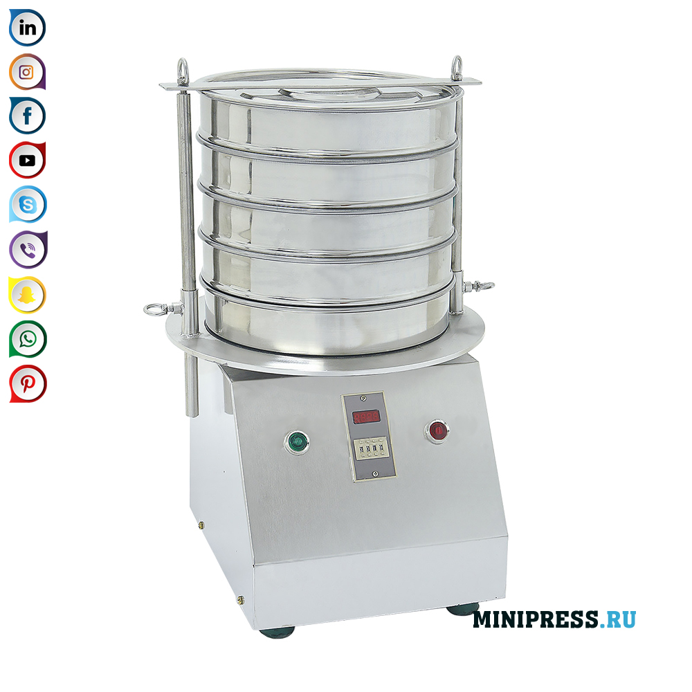 Við vinnum á þessum titrandi skjá og keyptum annan - atvinnumanninn með framleiðni 100 kg á klukkustund. Nú eru tvær gerðir - iðnaðar sigti og rannsóknarstofu sigti.