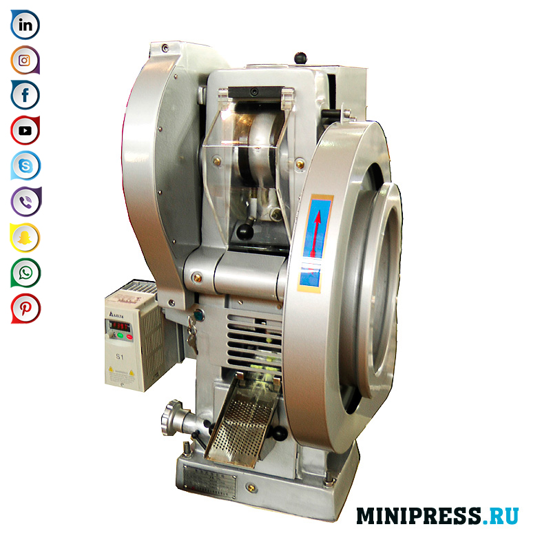 Töflupressa sem hægt er að nota í lyfja-, efna- og matvælaiðnaði, í duftmálmvinnslu til framleiðslu á töflum, kubba og boluses úr lausu duft efni. Úr fóðurtoppinum er duftið metið í fylkið. Bein pressun á dufti og kornuðu efni er notuð. Að fá töflur er framkvæmd með tveimur kýlum (efri og neðri) í fylkinu. Með því að skipta um pressatólið er hægt að framleiða töflur með þvermál 6 til 20 mm. Hámarkshæð fullunnu töflanna er 13 mm. Hönnun pressunnar gerir ráð fyrir uppsetningu á einni, tveimur og þremur stöðuhöggum, en í einni pressuferli eru 3 töflur með þvermál 7 mm, eða 2 töflur með þvermál 10 mm eða 1 töflu með þvermál 20 mm er hægt að fá. Pressan virkar sjálfkrafa. Áður en þú tengir pressuna við netið og byrjar að vinna, verðurðu að kynna þér myndbandsleiðbeininguna vandlega og kynna þér meginreglur um notkun þess. Eftir það mun rekstur þess verða skiljanlegur og einfaldur fyrir þig. Pressan er með rafmótor, sem og aflúsunarhjól með handfangi. Öll aðlögunarvinna og stillingar eru gerðar í handvirkri stillingu með því að snúa hjólinu. Verið varkár þegar rafmótorinn er tengdur, áttin ætti að samsvara örinni. Duftið er hlaðið inn í pressuna í gegnum trektarformaðan tappa. Það er auðvelt að fjarlægja það, þvo það og setja það upp aftur. Duft er gefið frá hoppunni í gegnum matarann. Þegar pressunni er snúið er duftinu gefið í fylkið, þar sem það er ýtt á og síðan er lokið töflunni ýtt upp á yfirborðið. Það er stjórnunareining á þrýstihópnum. Við munum búa til öll sett af pressatólum á pöntun (kýla og deyja fyrir snúnings töflupressur).