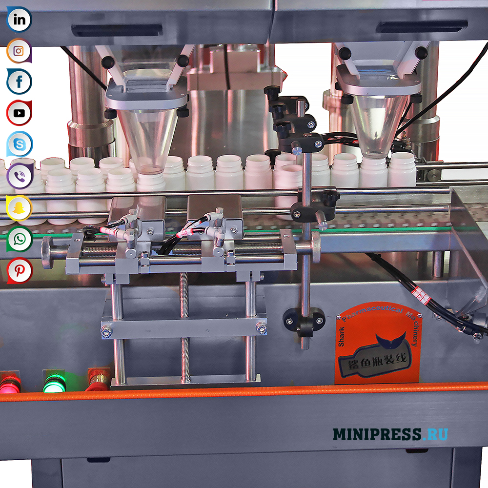 Sistem ganda penghitung getaran dan pengemasan tablet dan kapsul gelatin keras adalah bagian dari jalur otomatis untuk mengemas tablet dan kapsul gelatin dalam botol plastik dengan menyegel leher botol dengan selaput aluminium, tutup capping, label perekat stiker. Desain ini memiliki panduan seperti gelombang di mana tablet atau kapsul gelatin dipindahkan ke zona kontrol oleh sensor optik, dan kemudian ke dalam botol. Kuantitas diprogram dalam menu panel kontrol elektronik. Kelompok tablet atau kapsul dituangkan ke dalam botol yang dimasukkan ke zona pengisian melalui ban berjalan. Selanjutnya, botol-botol dipindahkan ke mesin capping.