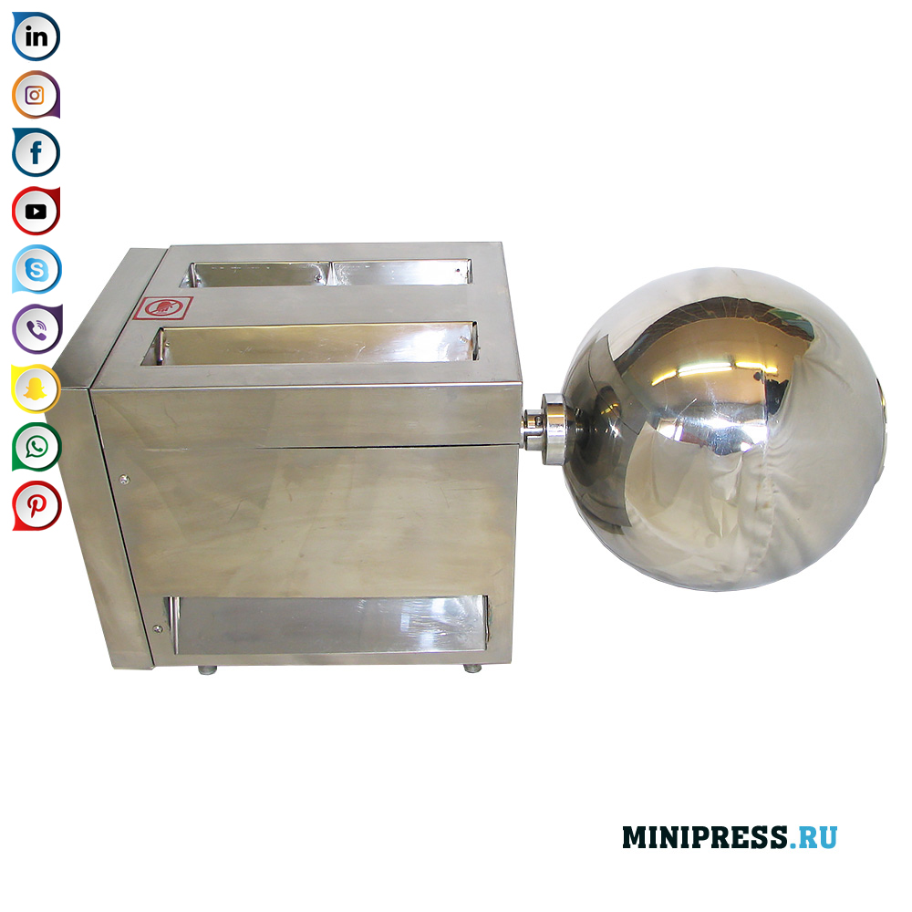 למודל ציוד זה שתי פונקציות. הראשון הוא היווצרות כדורים עגולים מחומרים דמויי בצק פלסטיק. השנייה היא שימוש בדוד מחומם לייבוש כדורים או לציפוי דרגי או טבליה. המכונה עשויה נירוסטה. הסט כולל כיריים חשמליות לחימום, המותקנות מתחת לדוד מסתובב. עיקרון הפעולה של הכדור הראשון הוא כדלקמן: הבצק מוכן מחומר אבקה ומים. לערבוב וקבלת הבצק תוכלו להשתמש במטבח או במערבל בצק תעשייתי. יש לבחור בתכונות של הבדיקה כתוצאה מניסויים, להתאמת צפיפותו ודביקותה. עם קבלת מבחן הצפיפות הרצויה תוכלו להתחיל בייצור כדורים. הפעל את המכונה במצב הפעלה, נפרד בידיים חתיכת בצק קטנה. הניחו אותו בחלק הראשון של הפירים המסתובבים. זה יוביל להיווצרות צלחת בעובי מסוים. ואז המפעיל מניח את הלוח שהתקבל כשידיו על האתר להיווצרות צלחות גליליות ארוכות. ואז הוא מפריד, במידת הצורך, את הלוחות זה מזה ומעביר אותם עם הידיים לאזור היווצרות הכדורים. כדורים מוגמרים יוצקים למגש המחליף. כדי להאיץ את תהליך הייבוש, ניתן להכניס את הכדורים לדוד מסתובב ולהפעיל תנור חשמלי.