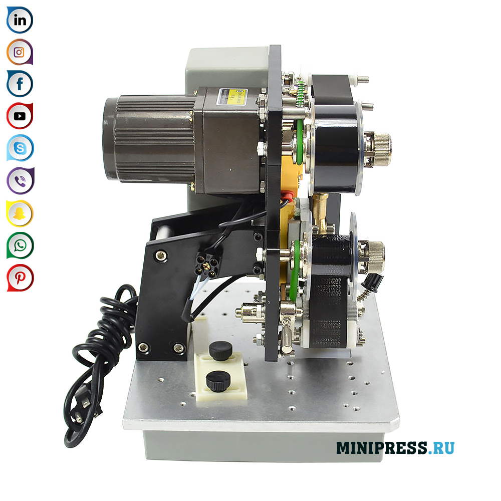 Модел на полуавтоматски електричен печатач за печатење датуми на истекување и сериски броеви за печатење со топла информација за печат на која било мека површина на пакетот. Работи со термички ролни од разни бои. Можно е да се користат метализирани марки на датумот на производство со користење на оваа опрема. Комплетот доаѓа со пластична кутија со букви за пишување, од кои можете да комбинирате било какви дигитални и комбинации на текст. Исто така под нарачка произведуваме и продаваме букви според дизајнот на клиентите. Погоден десктоп модел со педала за контрола на стапалото.