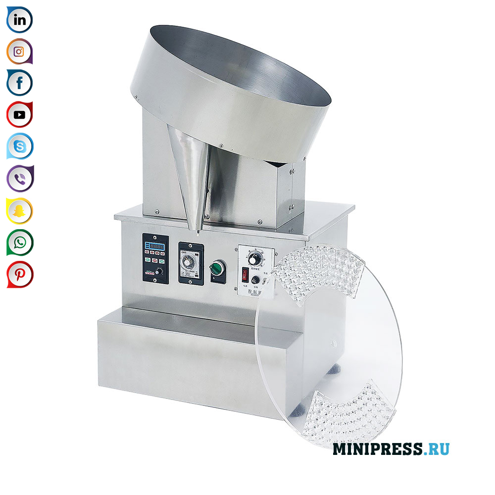 Принципот на работа е во рамките на бункерот, ротирачки пластичен диск е поставен на оската на електричниот мотор, дискот има групи на дупки. На барање на клиентот, се прават заменливи дискови за секоја големина и број на таблети. Таблетите се истураат во бункерот на машината за полнење, дискот почнува да се врти бавно, додека таблетите спаѓаат во ќелиите на дискот, вишоците на таблети се отстрануваат од ограничувачите. Апчиња од ќелиите спаѓаат во посебна зона од која се влеваат во заменети банки. Машината има дополнителна опција - прилагодливи вибрации, што помага да се пополнат клетките со таблети. Јачината на вибрациите може да се прилагоди рачно колку што е потребно. Исто така, постои и контрола на вртење на дискот, можете да ја прилагодите ротацијата на дискот на 1,2 или повеќе вртења кога ќе се активира сензорот. Ова овозможува да нарачате диск со групи дупки од 10 парчиња и да користите само еден диск, спакувајте 10 таблети, 20 парчиња, 30 парчиња и така натаму во тегли. Машината за пресметување има електронски диск за контрола на брзината.