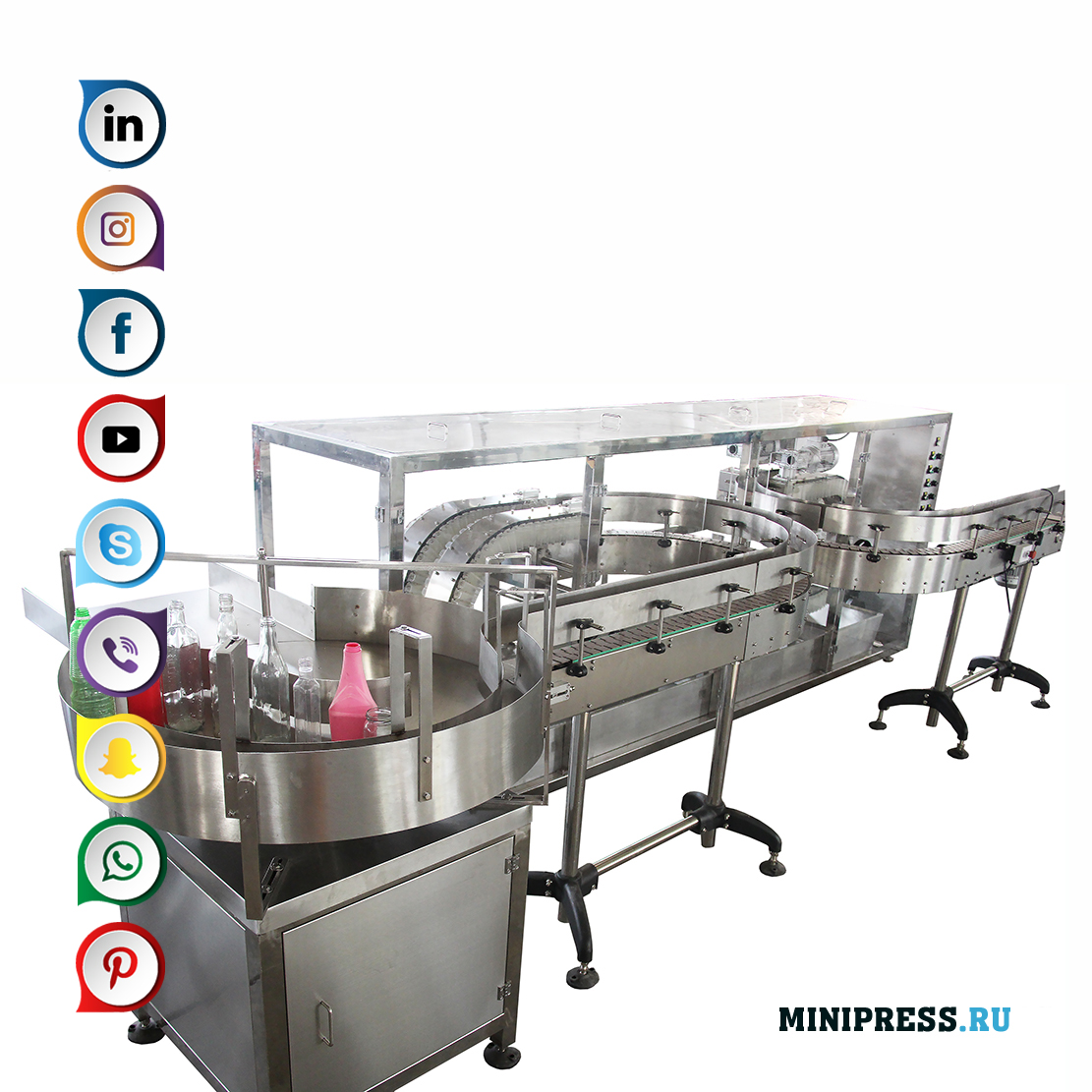 Masa rotativă alimentează sticle goale de plastic sau de sticlă individual pe o bandă transportoare care mută sticlele la unitatea de spălare. Din buncărul de depozitare, sticlele sunt alimentate la transportor, unde sticlele sunt întoarse și mutate la duzele din care apa intră sub presiune. Orientarea sticlelor cu gâtul în jos permite purjarea cu aer comprimat prin duză. Viteza transportorului, temperatura apei și alți parametri de spălare a sticlelor sunt controlate de operator. Zona de spălare este acoperită de panouri din plastic transparent. Mașina se potrivește perfect liniilor de îmbuteliere și captare a oricărei sticle. Calitatea chiuvetei este conformă cu standardele GMP. Mașina curăță eficient sticla în interiorul și în afara petelor și elimină picăturile de apă, ceea ce oferă condiții favorabile procesului de uscare. Toate piesele sunt din oțel inoxidabil.