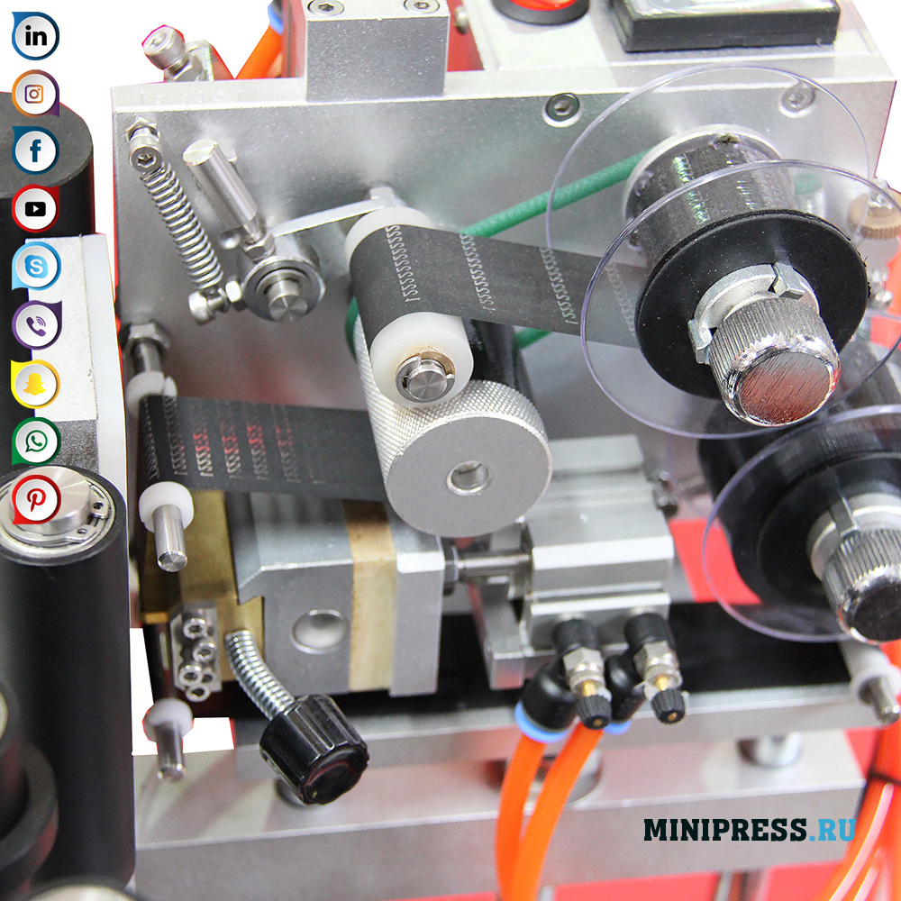 Аутоматски систем за пуњење транспортне траке. Систем се аутоматски укључује и извлачи налепницу из ролне и притисне налепницу. Компактна структура и лак рад. Фотоелектрични управљачки елементи, тачност означавања, функција „без објекта - заустављање“, аутоматско управљање налепницом која недостаје. Главни део машине за етикетирање је направљен од нерђајућег челика СУС304. Способност коришћења различитих величина налепница. Систем притиска етикете на површину боце избегава мехуриће ваздуха. Пуњење налепница из ролне са наглим електромотором. Ако је потребно, можете додати функцију штампања серије, бројева и датума производње. Опрема и материјали који се користе у производњи нерђајућег челика и легура високих легура испуњавају захтеве ГМП производње.