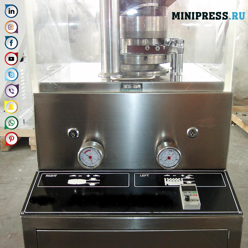 Овај модел је погодан за мале компаније, почетне произвођаче, научне, образовне институције које користе ротациону прешу за пресовање малих или експерименталних серија таблета, као и средство за уклањање погрешака технологија у процесу производње и одабир потребних компоненти за пресовање таблета. Ротациона преса је компактна и једноставна за подешавање. Модел РЗ-9 је ротациона подна преша типа типа. Шема преше је да помоћу преноса преноси ротацију од електромотора до ременице, на чијој је оси ротор. Преша је дизајнирана за директно прешање таблета. Продуктивност 17.200 таблета на сат. Овај модел долази са сетом калупа: матрице разних пречника (од 6 до 13 мм) и пробијачи. Удубљења са дугим телом су горња и постављају се у горњи део преше. Дно са кратким телом и дугим радним делом је дно и његов задатак је да гурне таблет из матрице. Инсталирају се на дну штампе. Штампа ради само у аутоматском режиму. Пре повезивања штампе са мрежом и започињања радова, морате пажљиво проучити видео упутство и упознати се са принципима његовог рада. Након тога, његово деловање ће постати разумљиво и једноставно за вас. Преша има електромотор, као и точкић за грешку са ручицом. Сви радови подешавања и подешавања се обављају у ручном режиму окретањем точка. Будите опрезни када прикључујете електромотор, смјер би требао одговарати стрелици. Прах се пуни у прешу кроз уклоњиви левак у облику лијевка. Може се лако уклонити, опрати и вратити натраг. Прах се доводи из спремника кроз додавач. Када се ротор преше окреће, прах се доводи у матрицу, где се преша, а затим се готова таблета гурне на површину. На тијелу за штампу се налази контролна јединица.