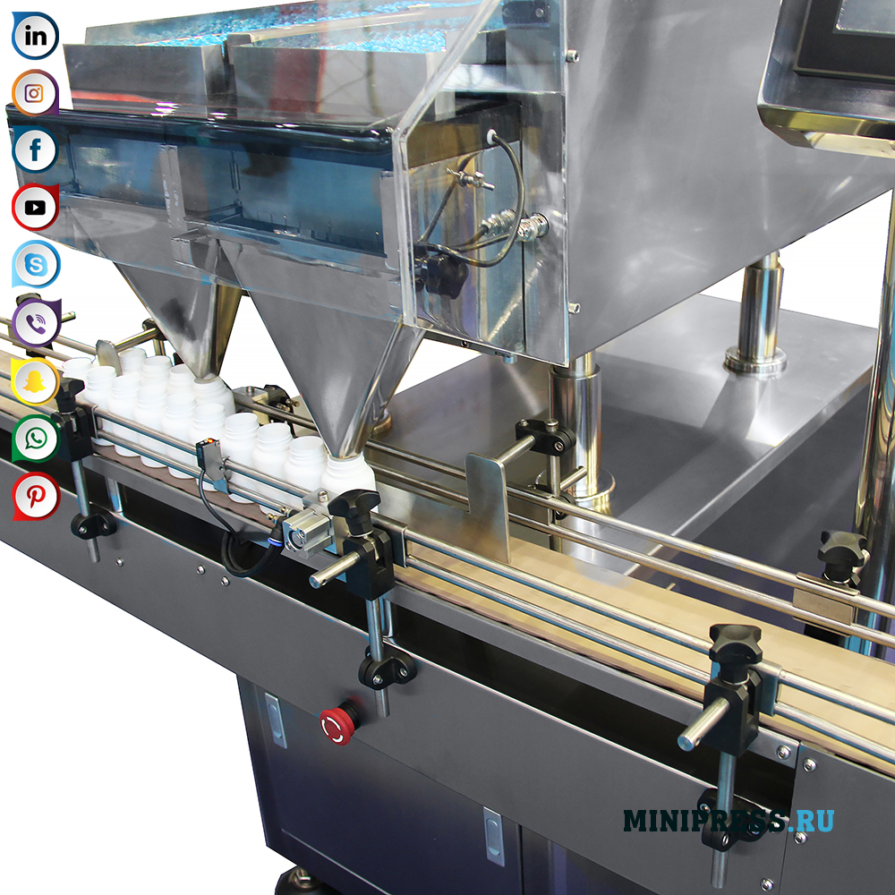 Çift titreşim sayaçları sistemi ve tablet ve sert jelatin kapsül paketleyicileri, şişelerin boynunu alüminyum membranlar, kapak kapakları, etiket yapışkanlı etiketler ile mühürleyerek plastik şişelerde tabletleri ve jelatin kapsüllerini paketlemek için otomatik bir hattın bir parçasıdır. Tasarım, tabletlerin veya jelatin kapsüllerin optik sensörler tarafından kontrol bölgesine ve daha sonra şişelere taşındığı dalga benzeri kılavuzlara sahiptir. Miktar elektronik kontrol paneli menüsünde programlanır. Tablet veya kapsül grupları, bir taşıma bandı yoluyla doldurma bölgesine beslenen şişelere dökülür. Daha sonra şişeler kapatma makinesine taşınır.
