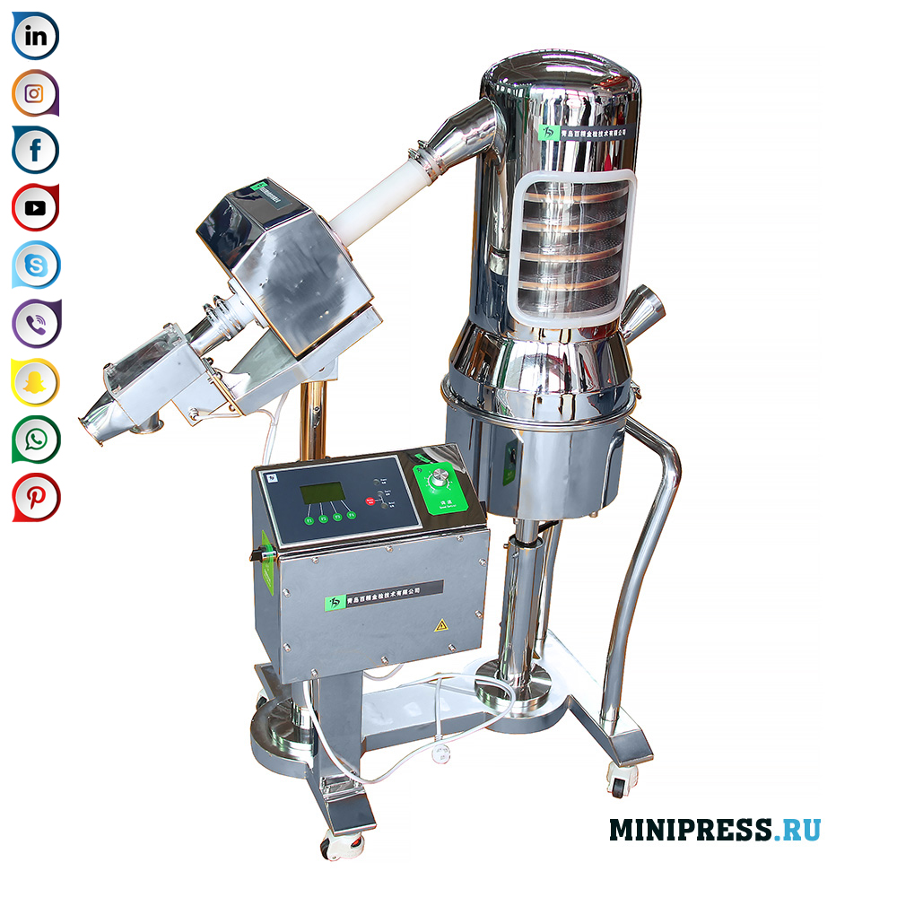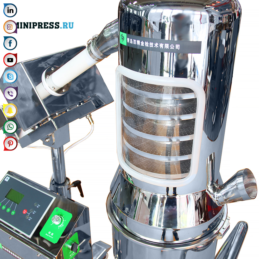 Робоча зона виробу та механічна зона розділені, щоб продукти та механічні деталі не контактували між собою, це робить процес безпечнішим. Час розбирання 5 секунд, проста та зручна операція, для очищення обладнання не потрібно користуватися будь-якими інструментами. Пристрій має низький рівень шуму, простоту очищення, гарний зовнішній вигляд та інші переваги. Внутрішня і зовнішня конструкція виготовлена з дзеркальної нержавіючої сталі, з гарним зовнішнім виглядом, простотою очищення всередині. ВКонструкція приводу європейського виробництва, обладнання тихе та стабільне. Принцип роботи, планшети завантажуються в дедуктор безперервним потоком, вібрація включається, планшети починають переміщатися з одного рівня пластин на більш низькі, проходячи через пластини, планшети очищаються, коли повітря і пил пробираються через перфорація пилососом. На найнижчому рівні повітряний потік з компресора (не входить в комплект) остаточно видуває пил і залишає зовні чисту. Потім очищені таблетки проходять через металошукач, де їх перевіряють на наявність металевих сторонніх частинок. Забруднені таблетки видаляють із загальної маси у спеціальній коробці.