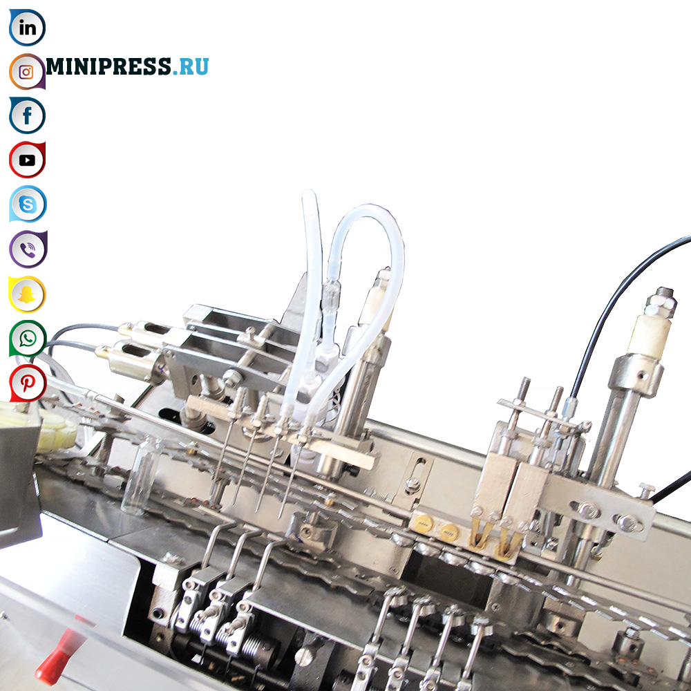 Một loạt các máy tự động độc đáo để làm đầy và niêm phong ống thủy tinh. Các mô hình khác nhau trong các lựa chọn nhỏ, liều lượng và hiệu suất. Các ống được lấy từ phễu, sau đó chúng được đưa vào đóng chai bằng băng tải. Người vận hành điều chỉnh liều lượng, trong khả năng của máy. Làm đầy trong ống thủy tinh được thực hiện bởi một nhóm. Máy mang một nhóm ống dưới kim, băng tải dừng lại và kim được hạ xuống ống. Tiếp theo là làm đầy các ống. Sau đó các ống thủy tinh được chuyển đến vùng đầu đốt. Nhiệt độ đốt cháy và cường độ ngọn lửa cũng có thể điều chỉnh. Sau khi cổ của ống được làm nóng bằng kẹp đặc biệt, đỉnh của ống được hình thành. Mặt trên có một đường viền tròn có hình dạng đồng phục đều đặn. Chiều cao của tất cả các ống thành phẩm và độ tròn được lặp lại liên tục, không có sự khác biệt. Chú ý, đối với hoạt động của máy để làm đầy và niêm phong ống thủy tinh, cần có máy để rửa và sấy ống. Cũng như một máy khử trùng tiêm nội bộ.